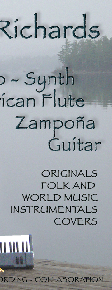 Says Richards,"When I play CoffeeHouses, or venues such as a listening room I do a mix of originals (a variety of humorous, folk, and uplifting songs) and covers such as Mr. Jones from the Counting Crows, artists such as Tom Petty, and Jimmy Buffet, John Prine, and lesser known covers and songs that I've picked up over the years from my travels from Newfoundland to Washington State. I do about 70% guitar, 30% Piano, vocals, instrumentals, and play the Native American flute as well as, the zampona accompanied by piano or guitar. I like to have a percussionist with whom I can improvise, and I enjoy collaborating in the world music genre." He adds, "People seem to enjoy my vocals these days. I've had some training and voice coaching." His Native American Flute music is relaxing and calming, and he loves improvising with drummers.