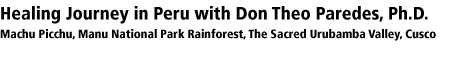 Don Theo Paredes, Ph.D. founder of the Poqen Kanchay Foundation, has invited ten participants through Mountain Spirit Institute to participate in a powerful experience in Cusco, Machu Pichu and the Manu National Rainforest area in Peru. This 14-day program is called a "healing journey" to the jungle of Peru for good reason. Don Theo is a well respected shaman of the highest regard in Peru and internationally. His personal mission, training, abilities and ethics are second to none. He will be the host for this journey which will include the citadel of Machu Pichu, the ruins and village of Ollantaytambo, the Sacred Valley, Cusco, and a journey to the Parque Nacional del Manu with a stay at an historic ranch.
