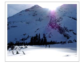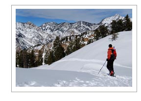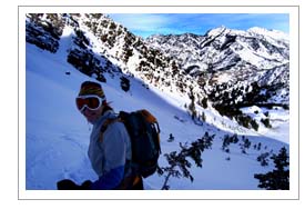 This area hosts the best snow in the world. The lightest, the driest powder lies in Big and Little Cottonwood Canyons just east of Salt Lake City. This is Alta and Snowbird taken one step farther, behind the ski areas of Solitude, Brighton and Park City. Occasionally we use lifts to reach the high altitudes and backcountry valleys. The rest of the time we use climbing skins to gain the high country. Lodging can be in the valleys' accomnodations or nightly camping in the high country, or a combination of the two, depending on weather and season.