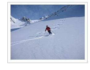 of lift served skiing (taking a tram to reach the higher ground) and backcountry ski touring and inter-village ski touring. One night might be in the historical Hospiz Hotel in the small alpine village of St. Christoph, the next night in a tent at the base of the Kaltenberg Glacier or the Schafeberg Mountain. In order to take advantage of all the terrain the Arlberg offers, one must ski with a guide/instructor who knows the area. The area's strengths lie in its backcountry where few go, behind the corner where the bowls and snowfields wait. The nature of the skiing changes greatly with the seasons, from powder in January and February to spring skiing on miles and miles of corn snow,in March and April. We ski powder/corn snow runs that consist of 4 to 7 miles and more.